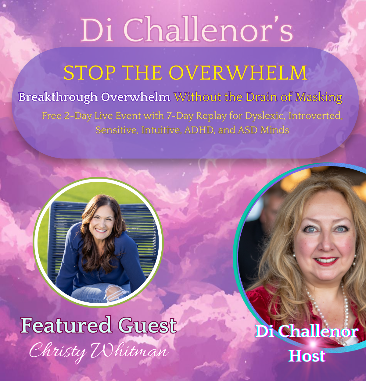 I’d love to invite you to Di Challenor’s Stop the Overwhelm, a free 2-day live event happening February 20 and 21, created specifically for neurodivergent and sensitive minds.